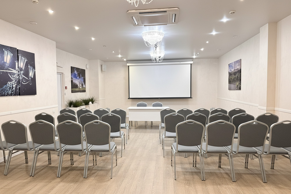 Светлый, комфортабельный конференц-зал идеально подходит для вашего мероприятия, оснащенный абсолютно всем необходимым для современной конференции: стационарный мультимедиа-проектор+экран, бесплатный Wi-Fi.
