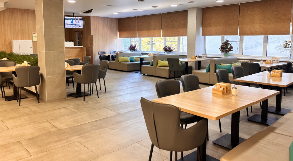 Уважаемые гости, предлагаем вам посетить наш обновленный ресторан на 200 посадочных мест. Стильный интерьер с просторными залами, создают непринужденную атмосферу легкости и комфорта. А сочетание великолепной кухни и искренне доброжелательное отношение к каждому гостю, располагает к приятному отдыху.